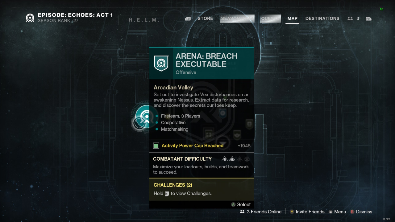 Из узла HELM в Режиссере, который изображен выше, вы можете выполнить миссию Breach Executable. Требуемый уровень силы активности для этого испытания — 1945. Это означает, что вы испытаете запланированный уровень сложности, если ваш уровень освещенности превысит этот порог.