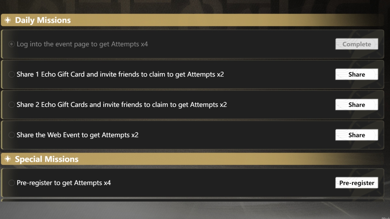 Как геймер, я предлагаю проверить свой инвентарь после использования бесплатного призыва. Я мог бы оказаться с четырьмя разными Эхо. Если мне посчастливилось получить 5 звезд, это бонус! Веб-событие все еще продолжается, поэтому я могу выполнять ежедневные и специальные миссии, чтобы заработать больше попыток призыва.