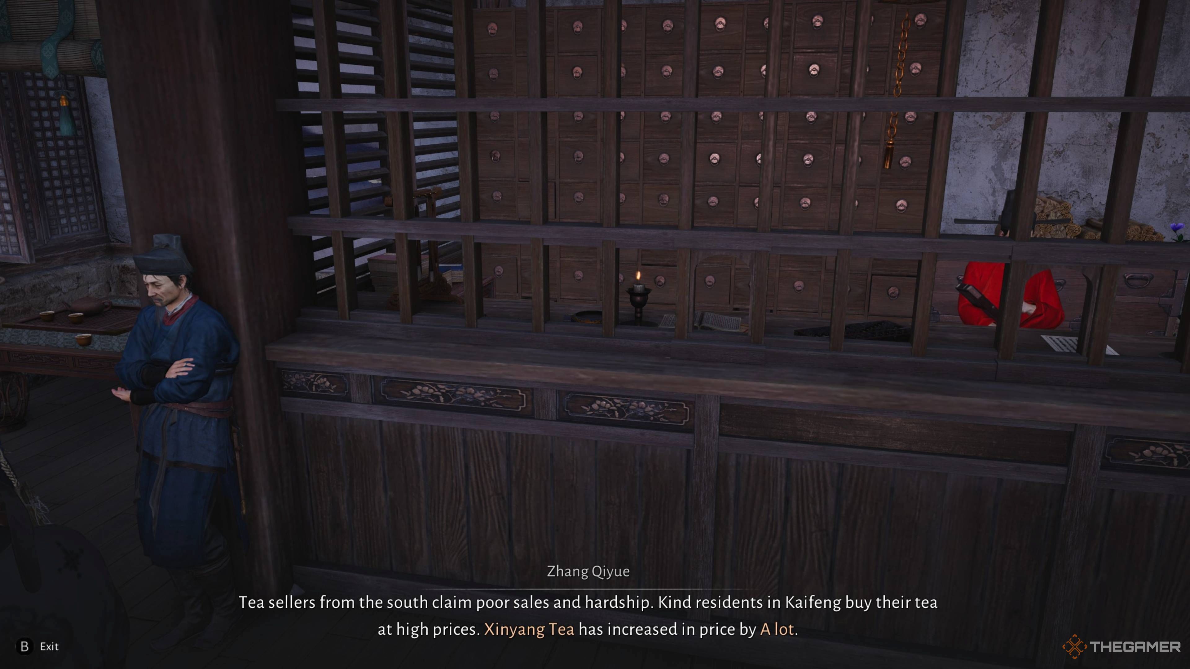 Окей, так что если вы хотите заработать денег, учитывая всё происходящее, вам действительно нужно обращать внимание на то, что продаётся и по какой цене. Я нашёл лучшее место для этого – Торговая комиссия в городе Кайфэн – она находится немного к северу от южного входа. Если вы поговорите там с Чжан Цююэ, он расскажет вам, какие цены меняются и какие товары сейчас пользуются спросом. Он просто спаситель!