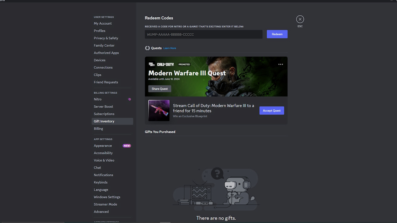 Чтобы получить доступ к инвентарю подарков Discord на вашем компьютере, сначала перейдите в раздел «Настройки». Вкладка «Инвентарь подарков» находится в левой части меню «Настройки». Нажав на него, вы обнаружите, что вас ждет один квест из Modern Warfare 3. Чтобы принять этот квест и начать его отслеживать, просто нажмите кнопку «Принять квест».