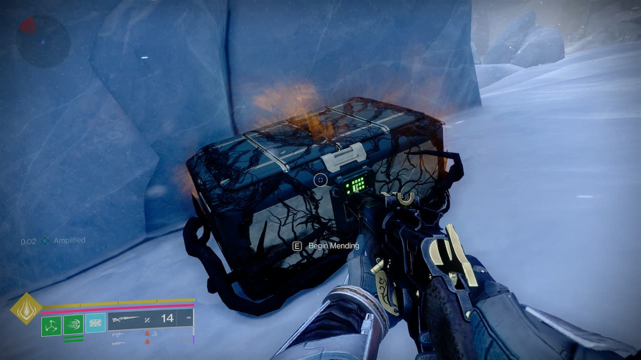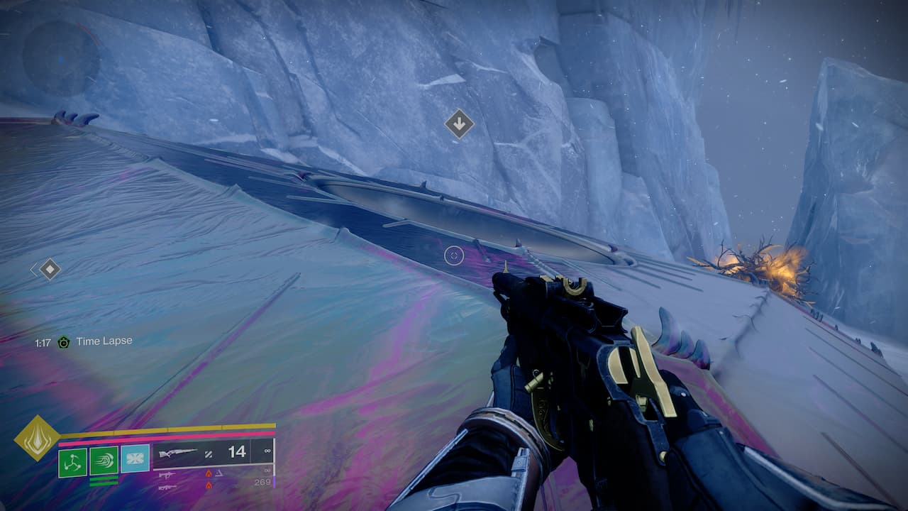 Как геймер, как только я доберусь до маркера внутри ледяной пещеры, я наткнусь на необычное призрачное перекати-поле. Чтобы завершить событие «Очищение», мне нужно «очистить» эту сферу, направив ее к ранее обнаруженной платформе. И, как и в обычном игровом процессе, я сделаю это, выстрелив в него пулями.