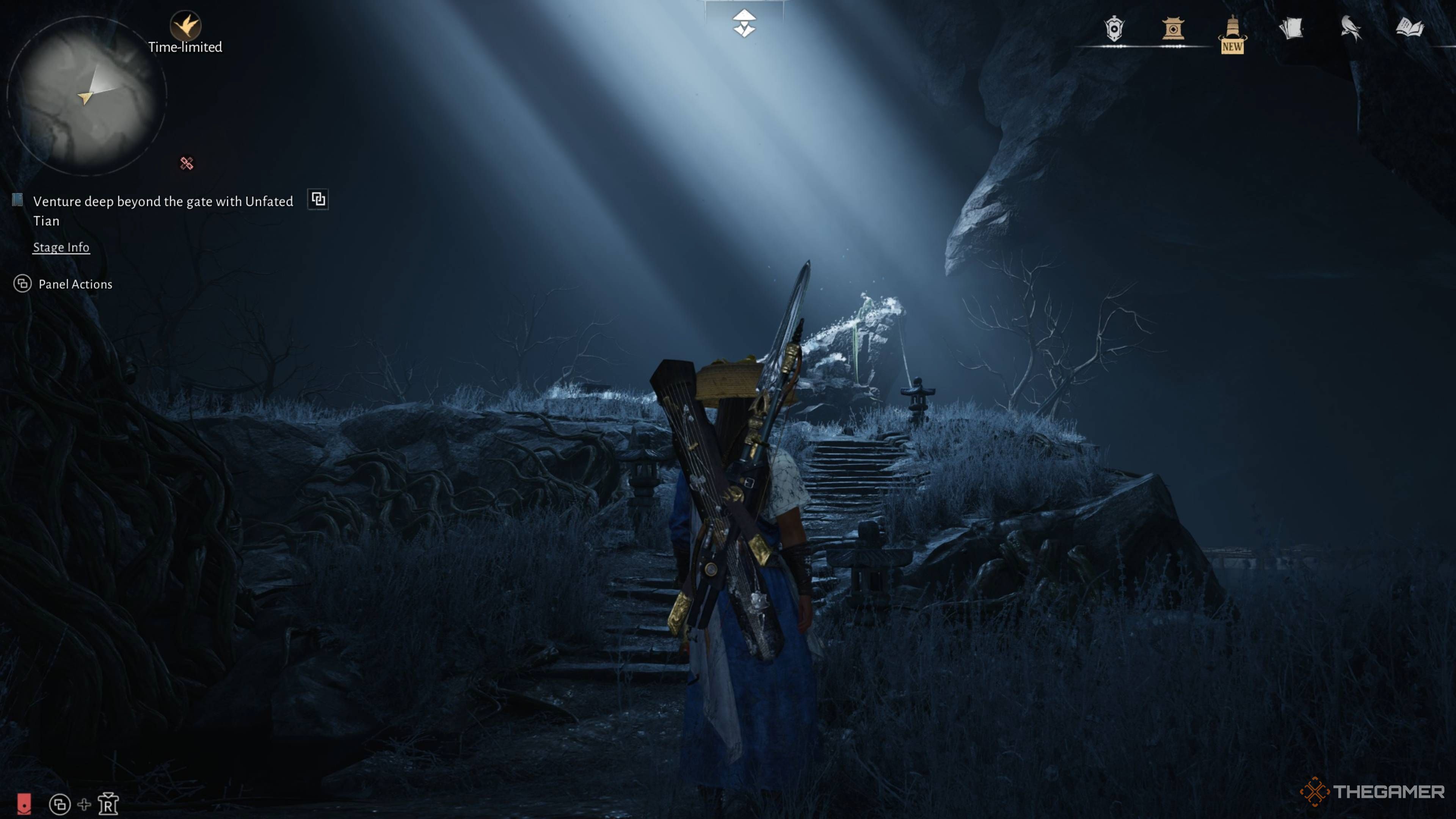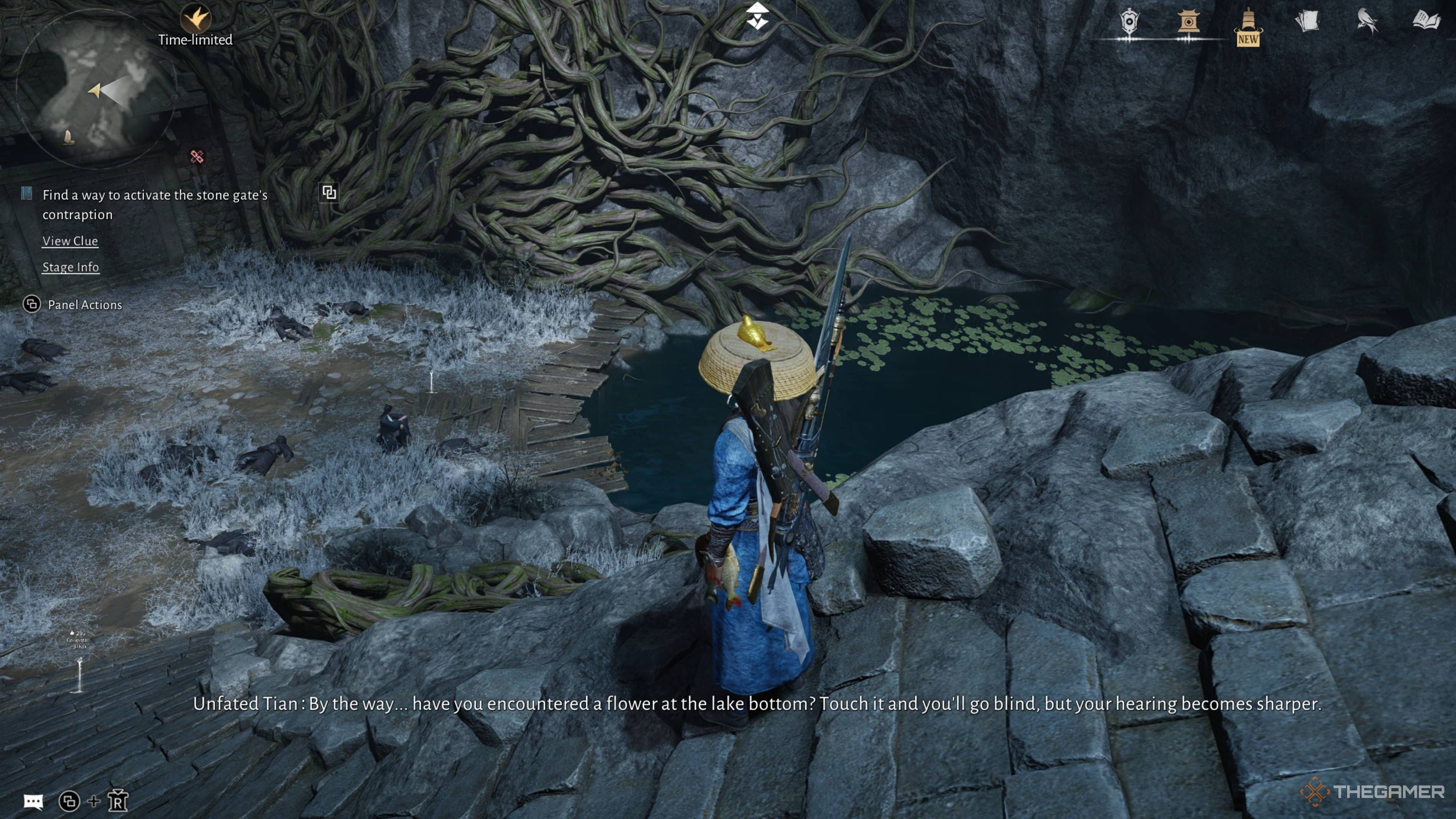 Вы найдете задание ‘Blind To The World’ в регионе Qinghe, недалеко от горы Moonveil Mountain. Оно происходит вокруг озера и статуи, скрытой под водой. Вы не сможете начать его сразу, даже если ваш персонаж заметит эту область. Сначала вам нужно поговорить с Unfated Tian, который стоит на утесе с видом на озеро, чтобы начать цепочку заданий.