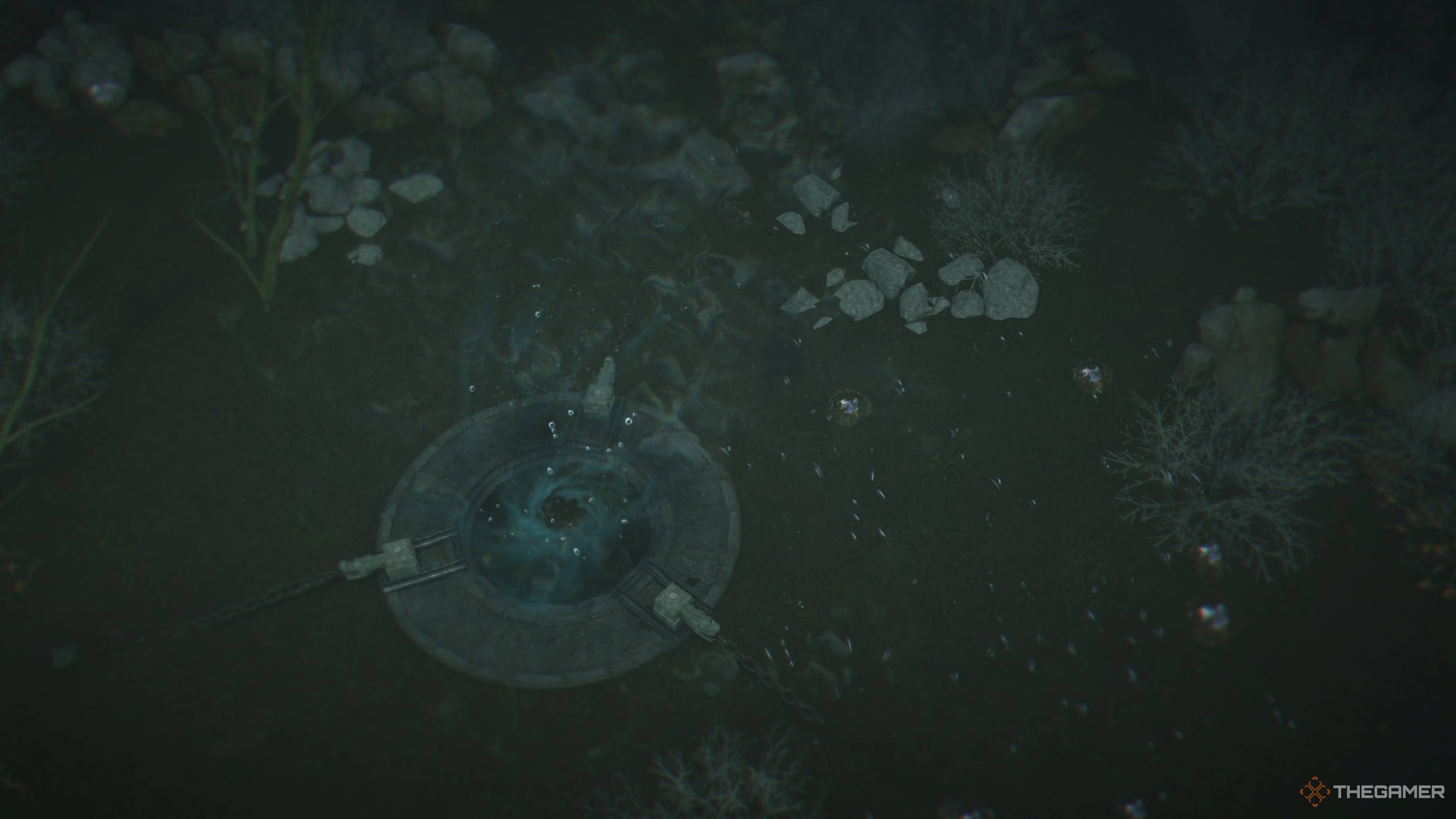 Прыгни в озеро и начни осматриваться. В середине ты обнаружишь большой слив с тремя цепями, подключенными к нему. Просто проследуй по этим цепям, чтобы увидеть, к чему они прикреплены, и активируй подключенные устройства. Как только ты разблокируешь все три, слив активируется, удаляя всю воду из озера и позволяя тебе пройти по его дну.