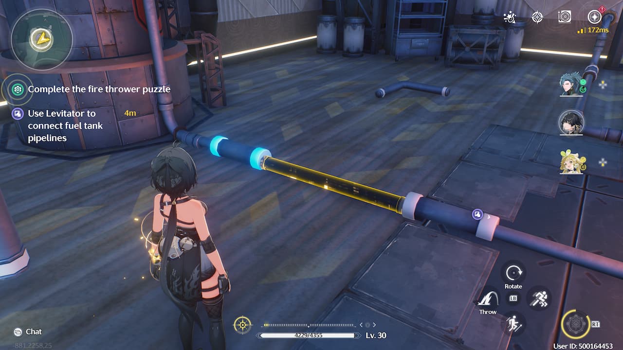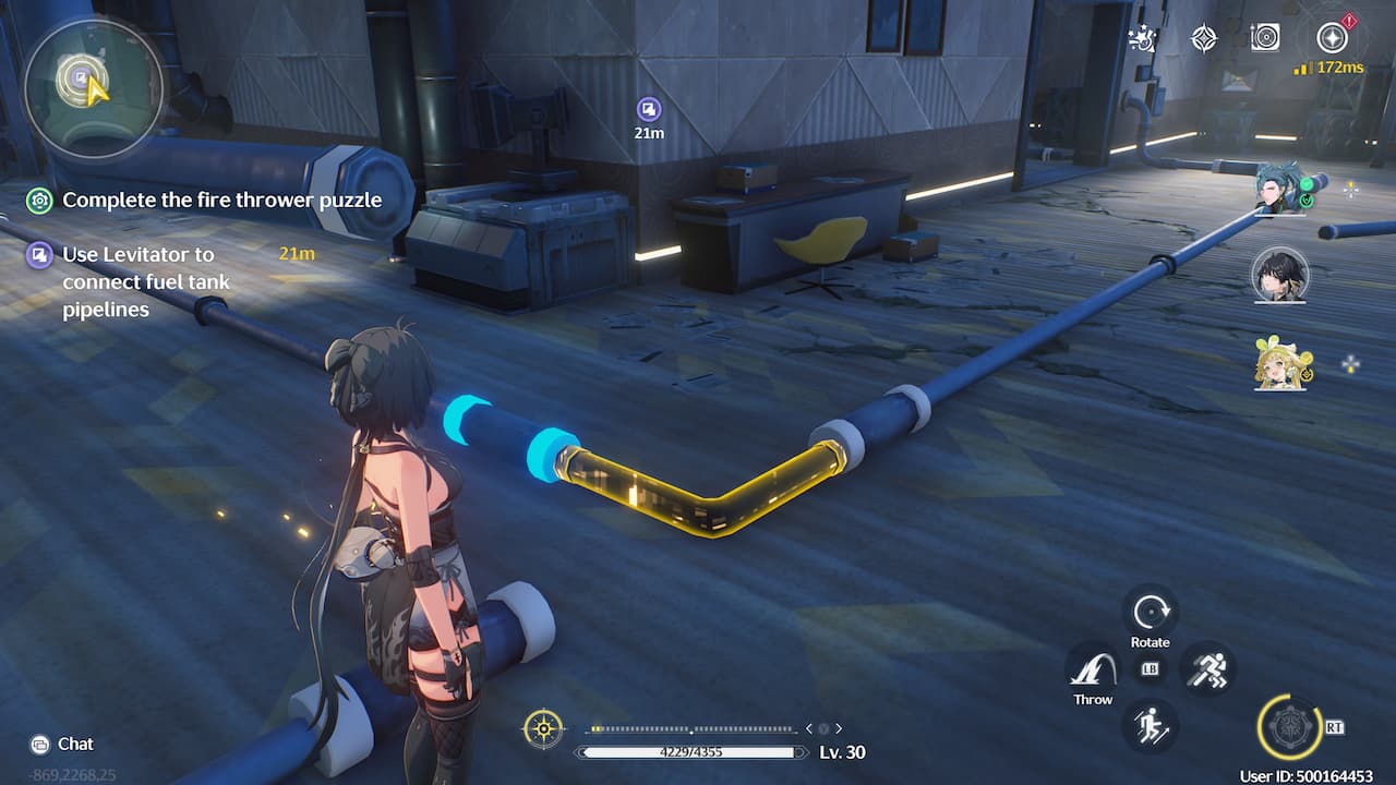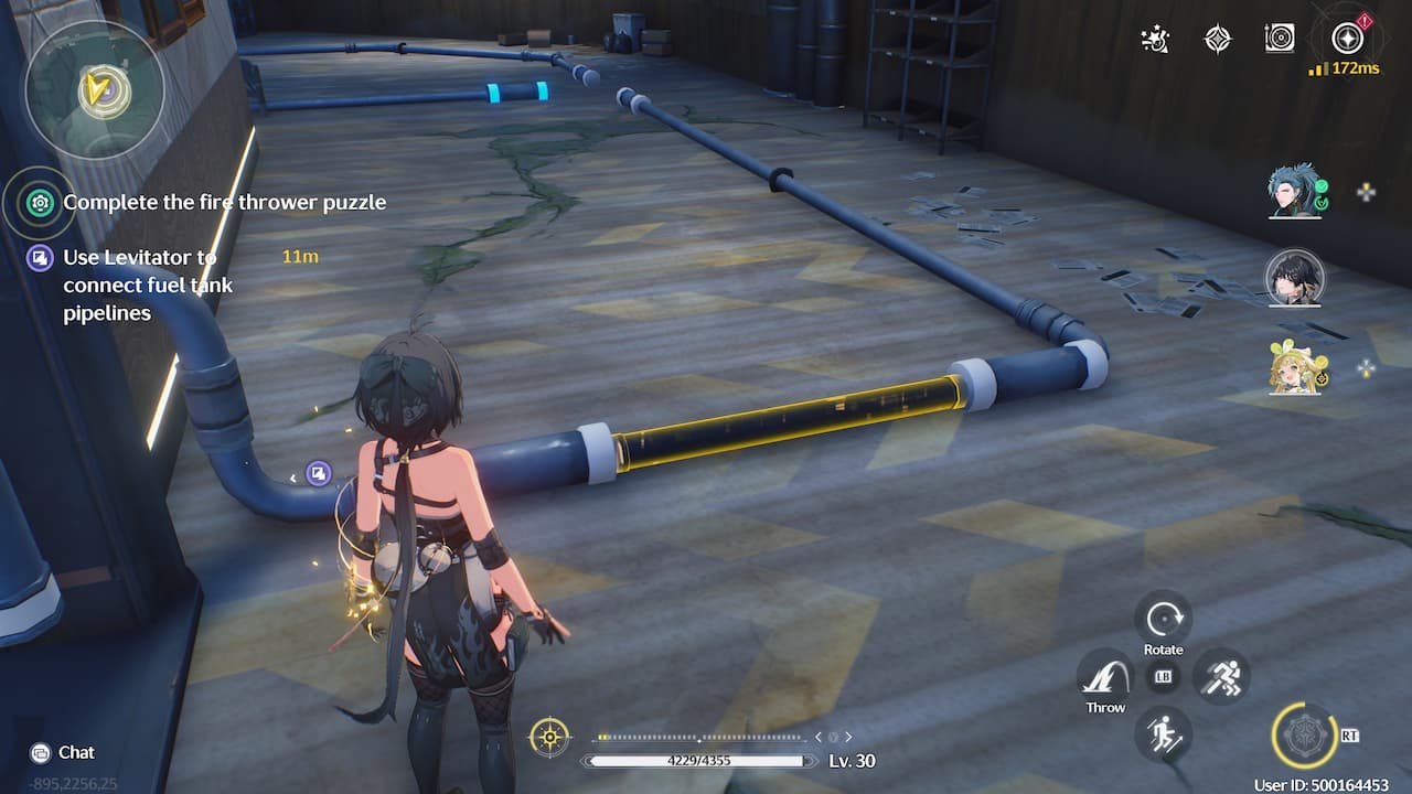 В пределах этого пространства вы встретите ворота для хранения компонентов затвора, которые открываются после решения загадки огнемета. Давайте приступим к делу и решим эту задачу! Это напоминает головоломку «подключи трубы». Чтобы выполнить поставленную задачу, вы должны соединить три отдельные трубы от топливных баков с огнеметом с помощью левитатора. По полу разбросаны различные прямые и L-образные трубы, которые можно использовать в своих проектах по прокладке трубопроводов.
