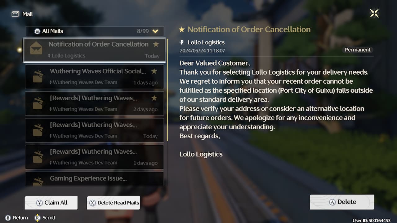 После завершения разговора с Вудроу вы найдете уведомление об отмене вашего заказа в своем почтовом ящике. Чтобы получить к нему доступ, откройте терминал и нажмите значок «Почта», расположенный внизу экрана. Оказавшись там, откройте почтовый ящик Lollo Logistics, чтобы получить информацию об отмене доставки, которая никогда не была инициирована вами.
