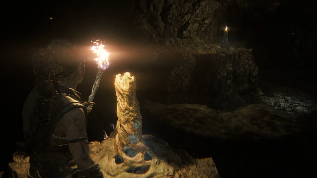 Теперь вы поняли, что этот персонаж — Сенуа на разных этапах времени. Возьмите факел, пройдите через нору и зажгите жаровню, расположенную на другой стороне. Поднимитесь по вновь созданному пандусу и зажгите жаровню, расположенную на холме.