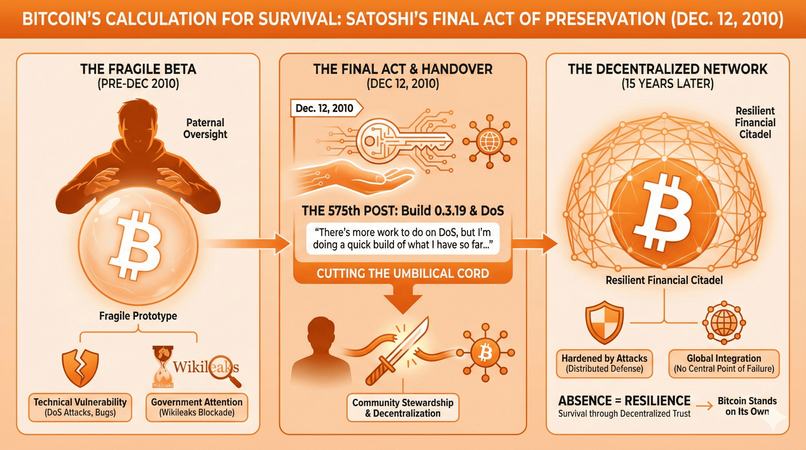 Убрав сигнализации «безопасного режима» и передав бразды прав Гавину Андресену, Накамото фактически перерезал пуповину — поступок, столь же дерзкий, как хождение по канату над зияющей пропастью. Возможно, он ушёл с тяжёлым сердцем, не уверенный, хватит ли установленных мер безопасности, убеждённый, что исчезновение — единственный способ сохранить своё детище живым и свободным от надвигающихся опасностей.