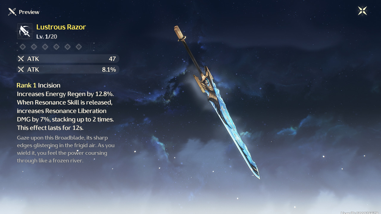 Сияющая «Блестящая бритва» — оптимальное 5-звездочное оружие Кальчаро, которое легко получить с помощью бесплатного 5-звездочного выбора оружия и постоянного знамени. Это оружие выделяется своей впечатляющей статистикой. С каждым использованием навыка «Резонанс» Кальчаро он усиливает получаемый урон «Освобождения резонанса». Учитывая, что Кальчаро может использовать свой навык «Резонанс» в общей сложности три раза за один период восстановления, совокупное улучшение будет быстро нарастать.
