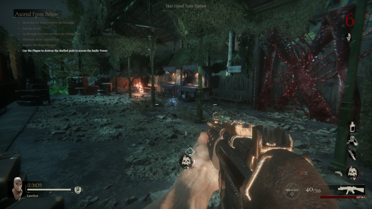 В передней части поезда вы можете сойти и добраться до железнодорожного вокзала острова Скер. У входа на станцию есть капсула, в которую вам следует выстрелить, а затем пройти через нее, чтобы добраться до Радиовышки. У основания Башни есть винтовая лестница, ведущая под землю. Как только вы доберетесь до нижнего уровня, ваша цель переместится на уничтожение крысиных гнезд в Центральном зале. Чтобы справиться с любыми капсулами с панцирем, с которыми вы столкнетесь, используйте Чуму и уничтожьте их.