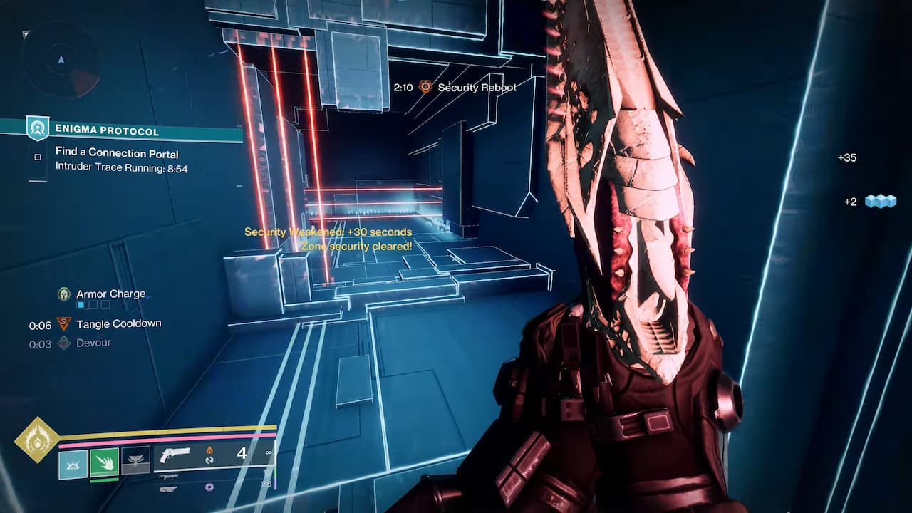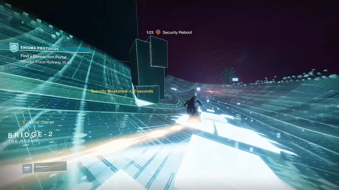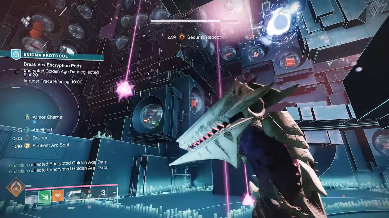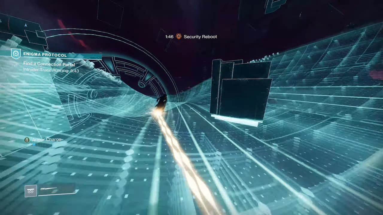 После запуска протокола Enigma пройдите через портал Vex. Это предоставит вам доступ в сеть Vex. Как только вы пройдете, в верхней части экрана появится таймер с надписью «Перезагрузка безопасности». Если этот обратный отсчет достигнет нуля, вы и ваша боевая группа погибнете. Ваша цель — найти портал подключений до истечения таймера перезагрузки безопасности. Для этого уничтожайте желтые модули Vex Security, которые встречаются вам на пути. Уничтожение первого модуля активирует таймер и вознаградит вас продлением на +30 секунд за каждое уничтоженное последующее.