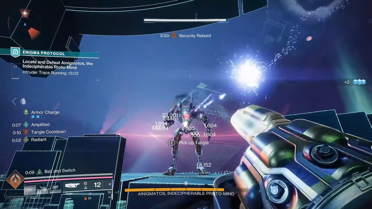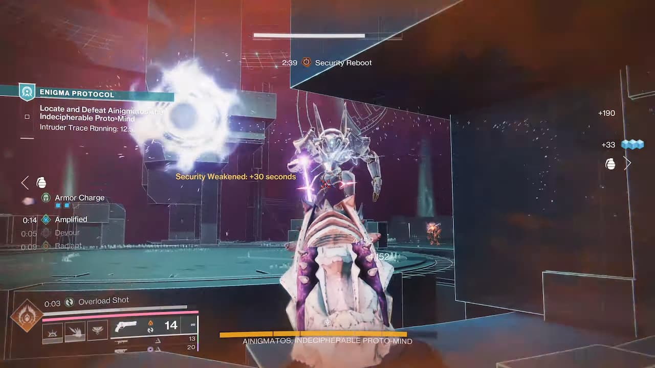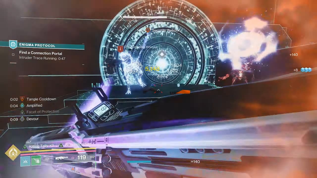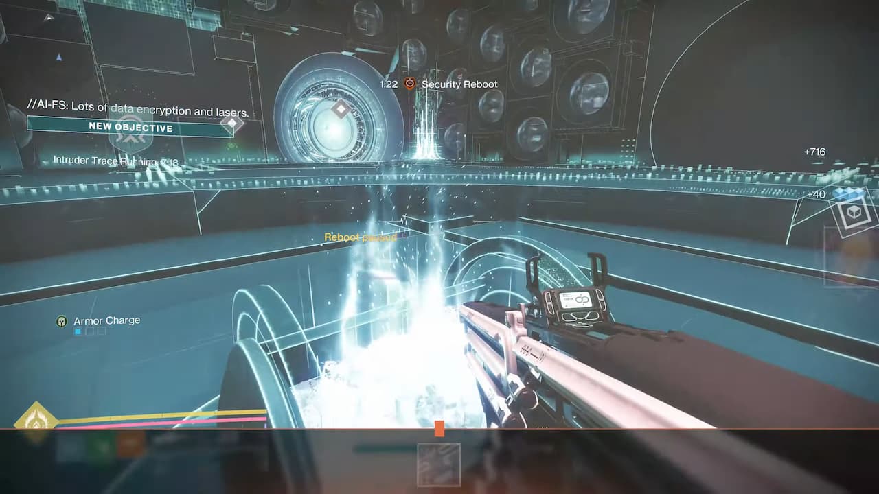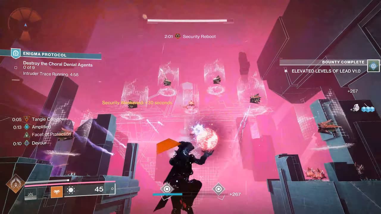 После запуска протокола Enigma пройдите через портал Vex. Это предоставит вам доступ в сеть Vex. Как только вы пройдете, в верхней части экрана появится таймер с надписью «Перезагрузка безопасности». Если этот обратный отсчет достигнет нуля, вы и ваша боевая группа погибнете. Ваша цель — найти портал подключений до истечения таймера перезагрузки безопасности. Для этого уничтожайте желтые модули Vex Security, которые встречаются вам на пути. Уничтожение первого модуля активирует таймер и вознаградит вас продлением на +30 секунд за каждое уничтоженное последующее.