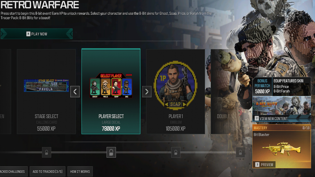Как поклонник Call of Duty: Modern Warfare 3 (MW3), я очень рад событию Retro Warfare. Это событие — отличная возможность для игроков пережить некоторые классические моменты и получить потрясающие награды. Все, что вам нужно сделать, это заработать XP, и по мере достижения определенных этапов вы получите новые косметические награды в стиле ретро. Кроме того, если у вас есть один из 8-битных скинов (который необходимо приобрести за реальные деньги), вы получите дополнительно 5000 XP за матч во время мероприятия.