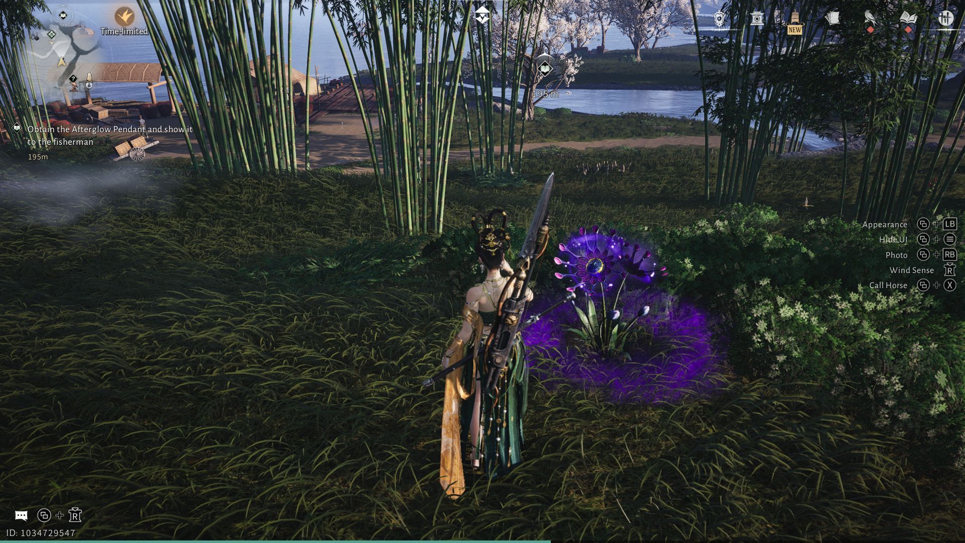 Используйте своё Чувство Ветра, чтобы изучить цветок. Вы заметите дорожки фиолетового тумана, указывающие на группы бабочек – возможно, там есть одна большая группа или несколько маленьких. Выстрелите несколькими огненными стрелами, чтобы распугать бабочек, после чего вы сможете собрать лотос.